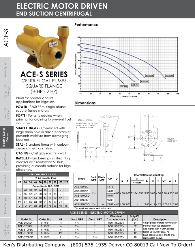 ACE- S Series Pumps Power – 3600 RPM Single Phase Square Flange Motors.