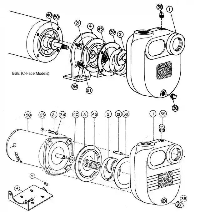 The BSE-S100 uses a “Square Flange” motor and specific mounting components, whereas the BSE-100 uses a “C-Face” motor. The parts for these two pumps are different, so always verify your model number before ordering spares.